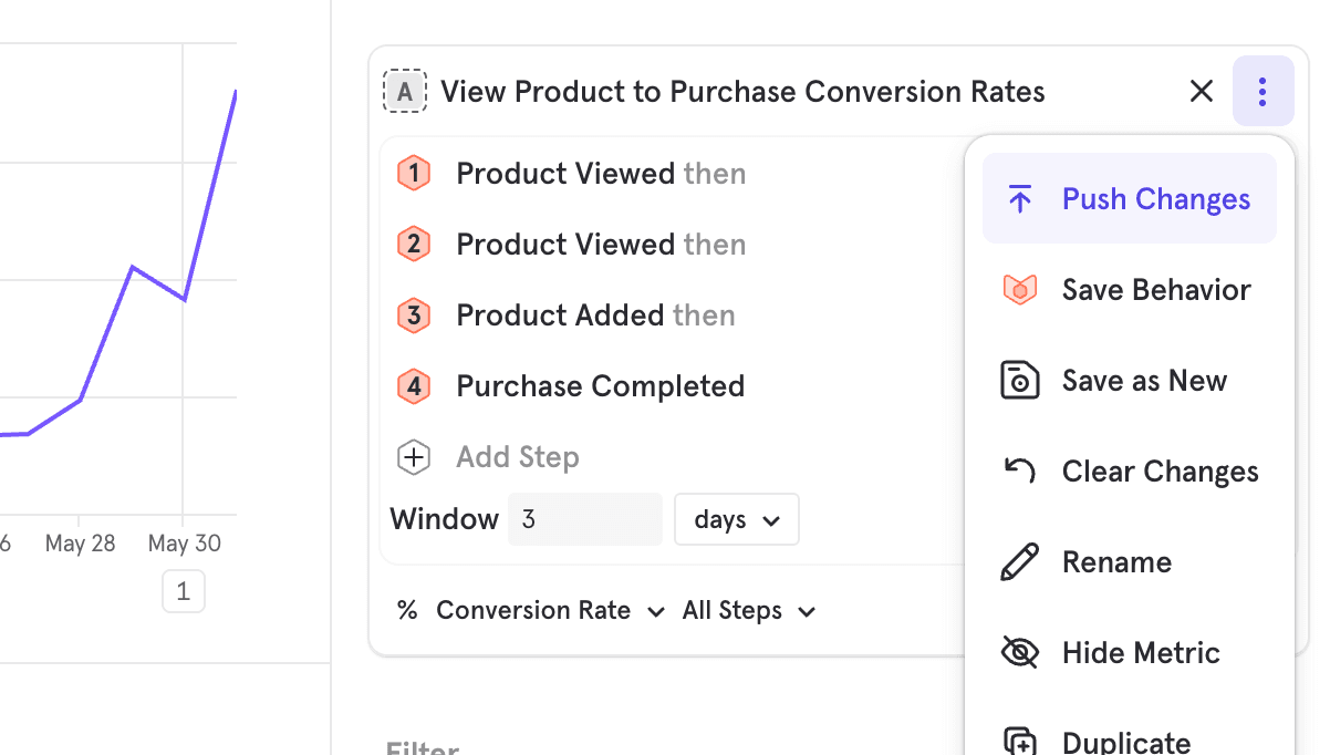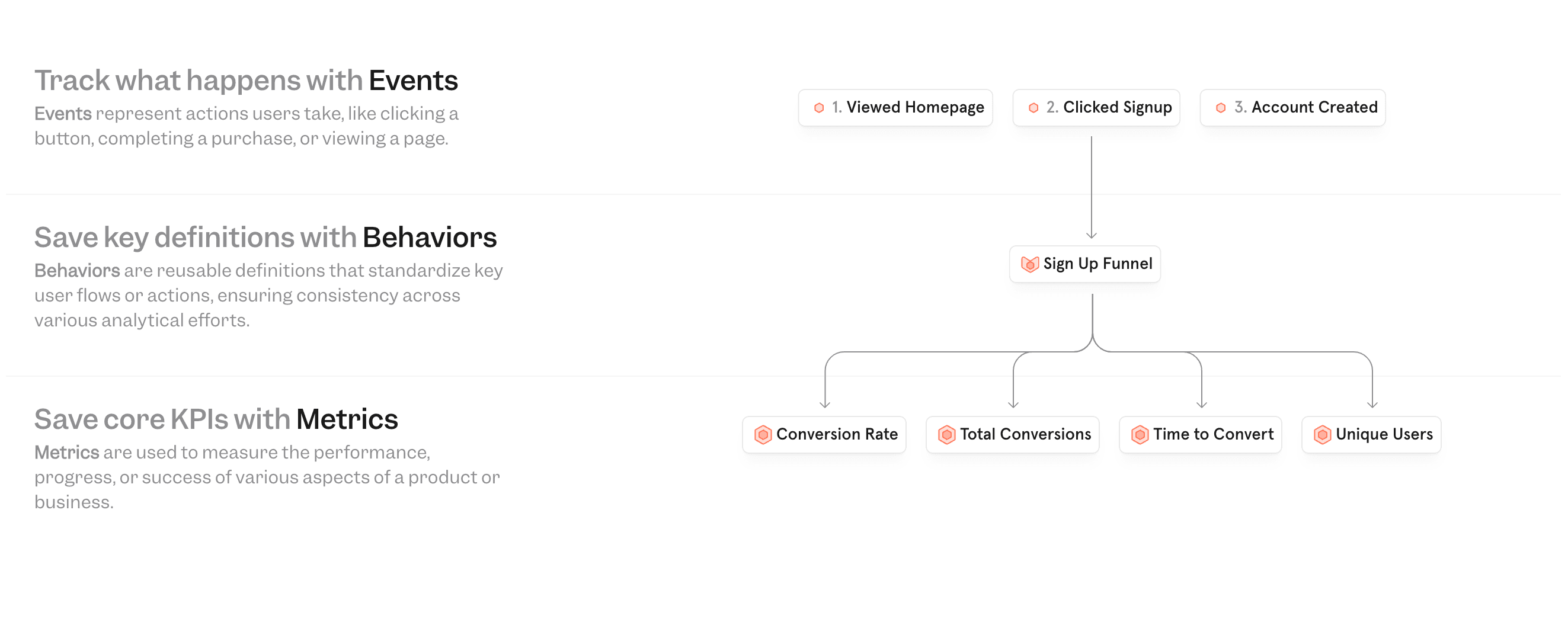 • Simplify updates: Centralize definition management. If a specific user behavior or flow changes (e.g. your “Signup Flow” removes a step), you only need to update the saved behavior definition once. All saved metrics that rely on that behavior (e.g. “Signup Flow Time to Convert,” “Signup Flow Conversion Rate,” “Signup Flow Unique Users”) will automatically reflect the updated Signup Flow definition.