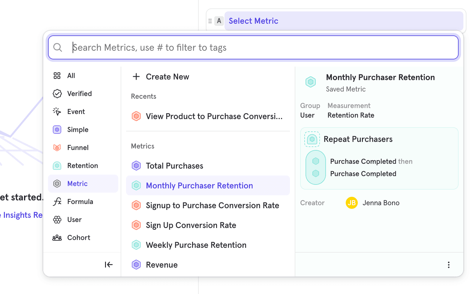 Saved Metrics are standardized definitions for your organization’s KPIs. They quantify the performance, progress, or success of various aspects of your product/business. Each saved metric is a measurement of an event, behavior, user cohort, or profile.