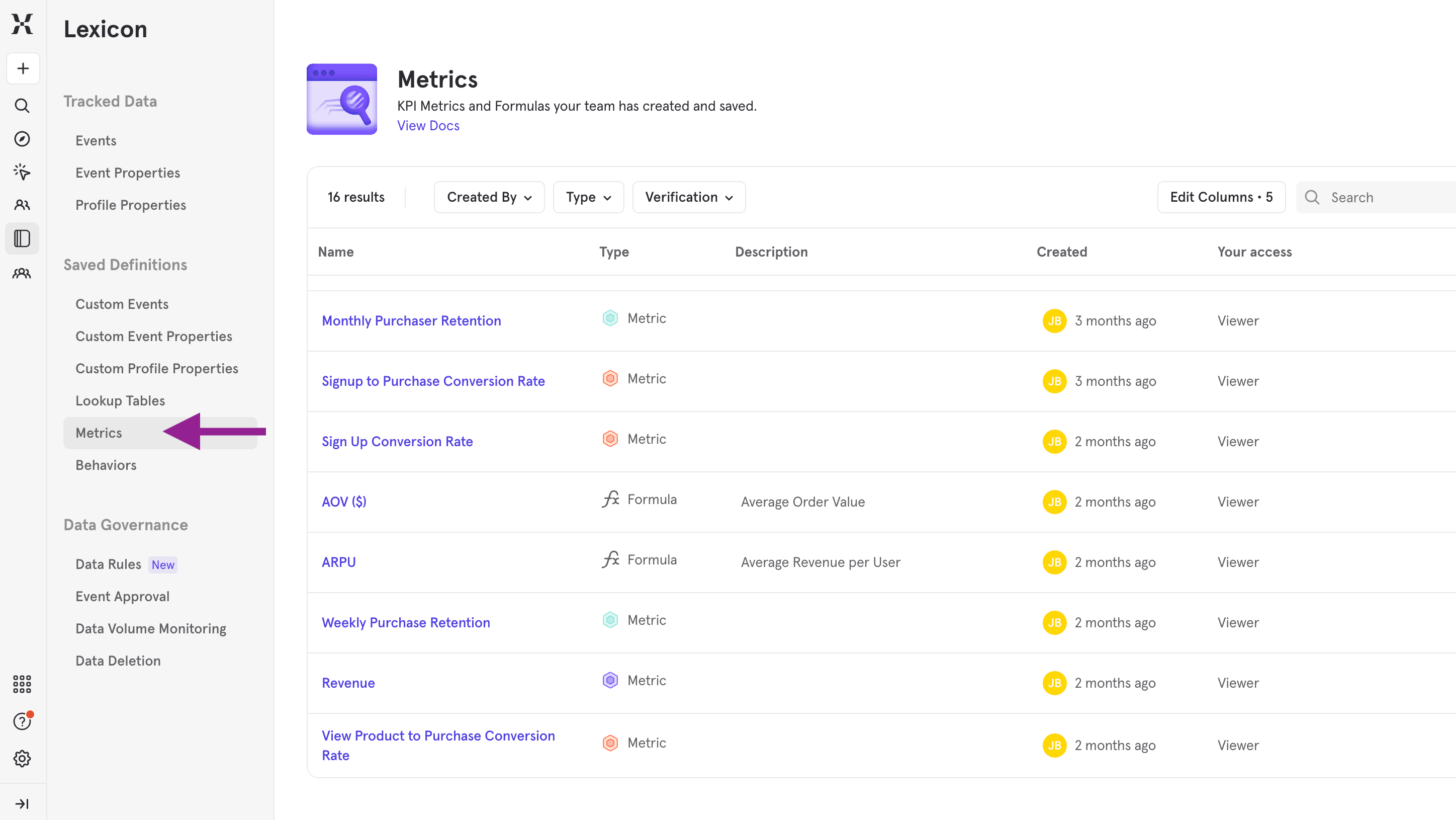 You can view all Saved Metrics and Behaviors in your project, add descriptions to clearly define them, and delete any unwanted definitions directly from the Lexicon.